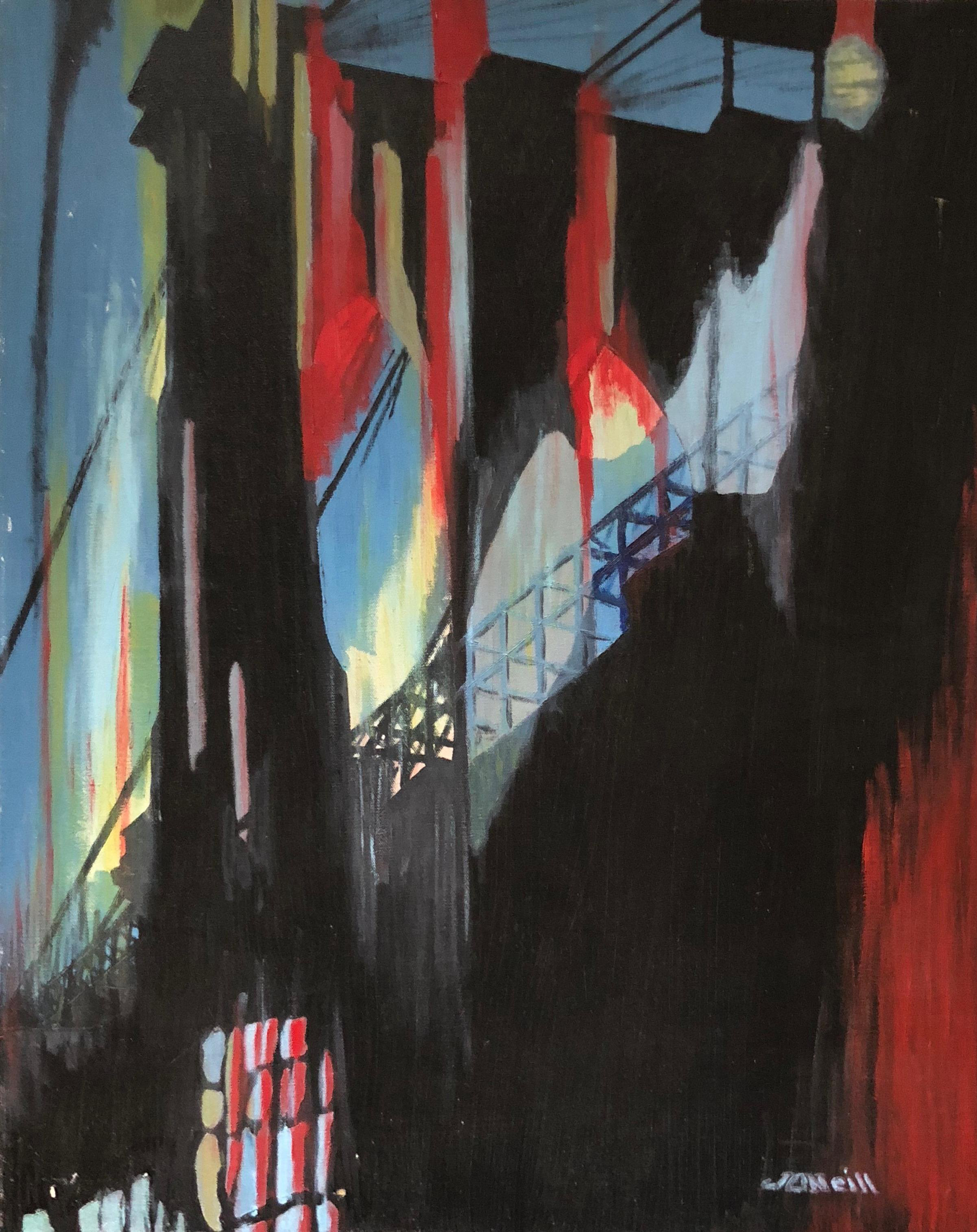 Mid Century Abstract Cityscape Bridge Painting