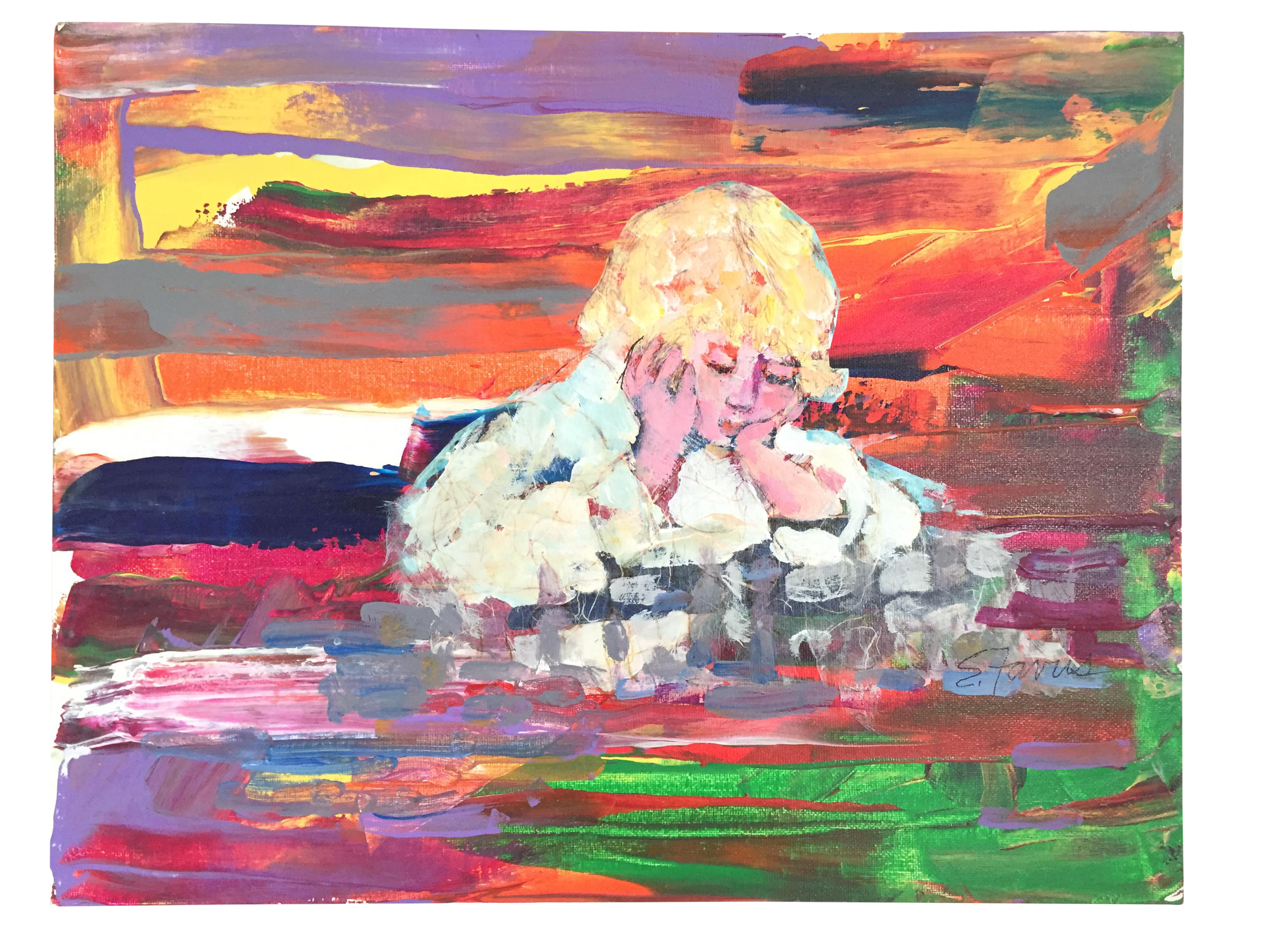 Abstract Colorful Blond Child Painting Signed Evelyn Favus