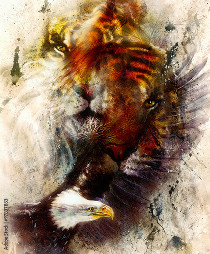 Beautiful Painting Of Eagle And Tiger On An Color Abstract