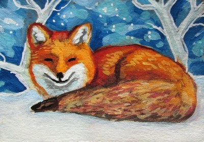 Original Aceo Sleepy Red Fox Painting Snow Winter Animal Ink