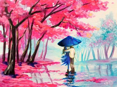 Lovers Walk Cherry Trees Easy Acrylic Painting Tutorial Step By